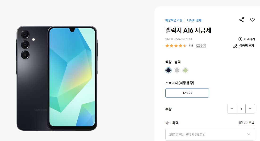| 🥇 | 갤럭시 A16 | 29만 원 | 6.7인치 | 4/6/8GB | 50MP | 5,000mAh | 방진방수 지원, 삼성 브랜드 |